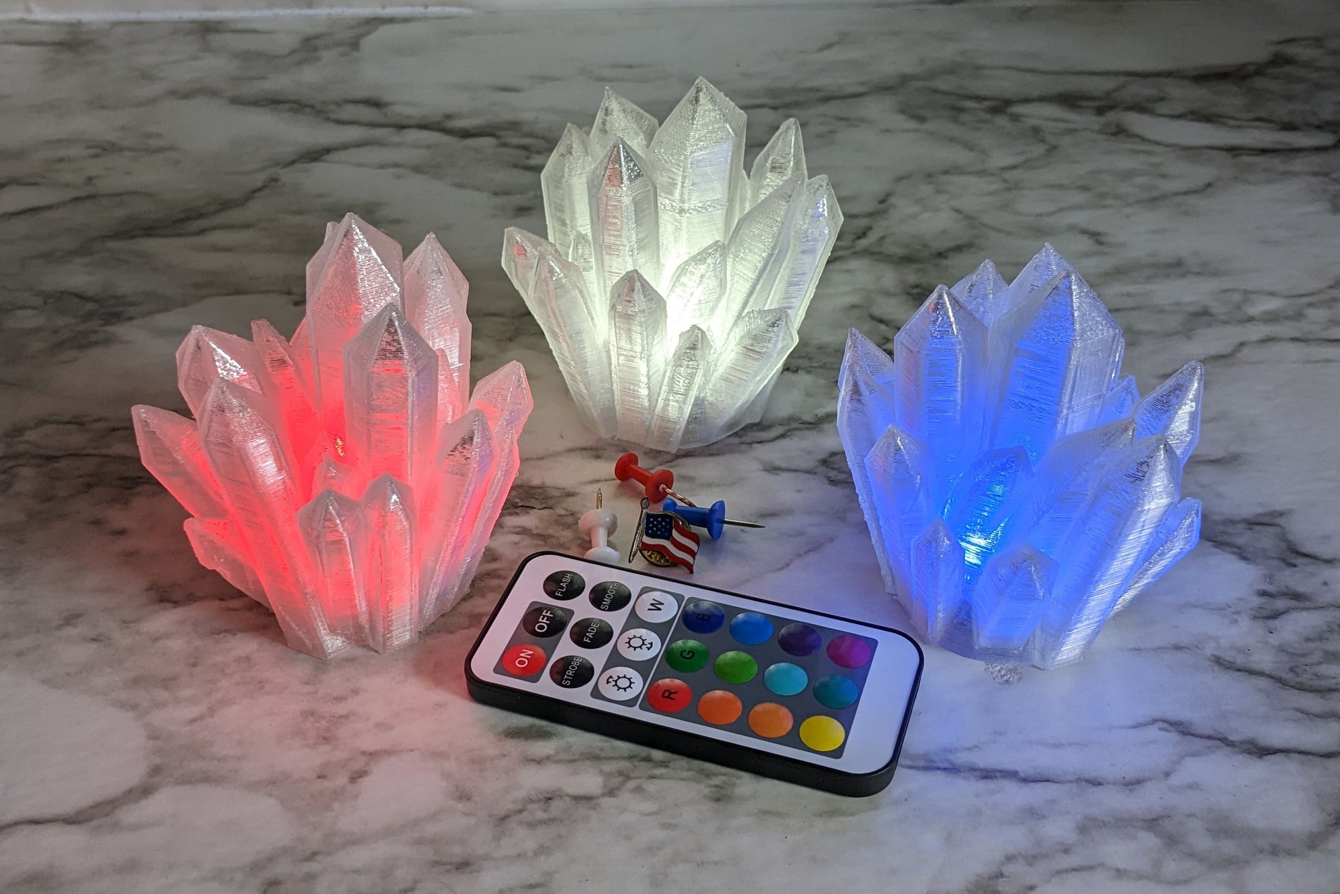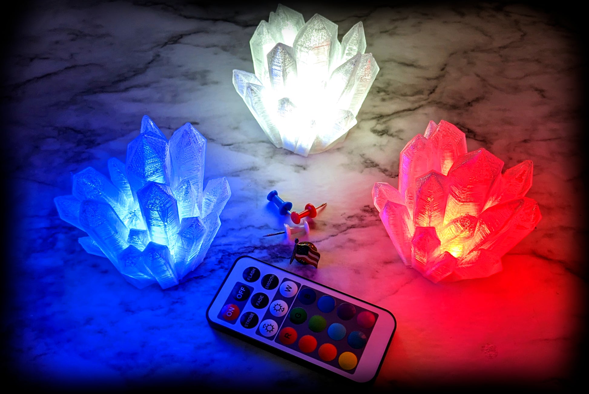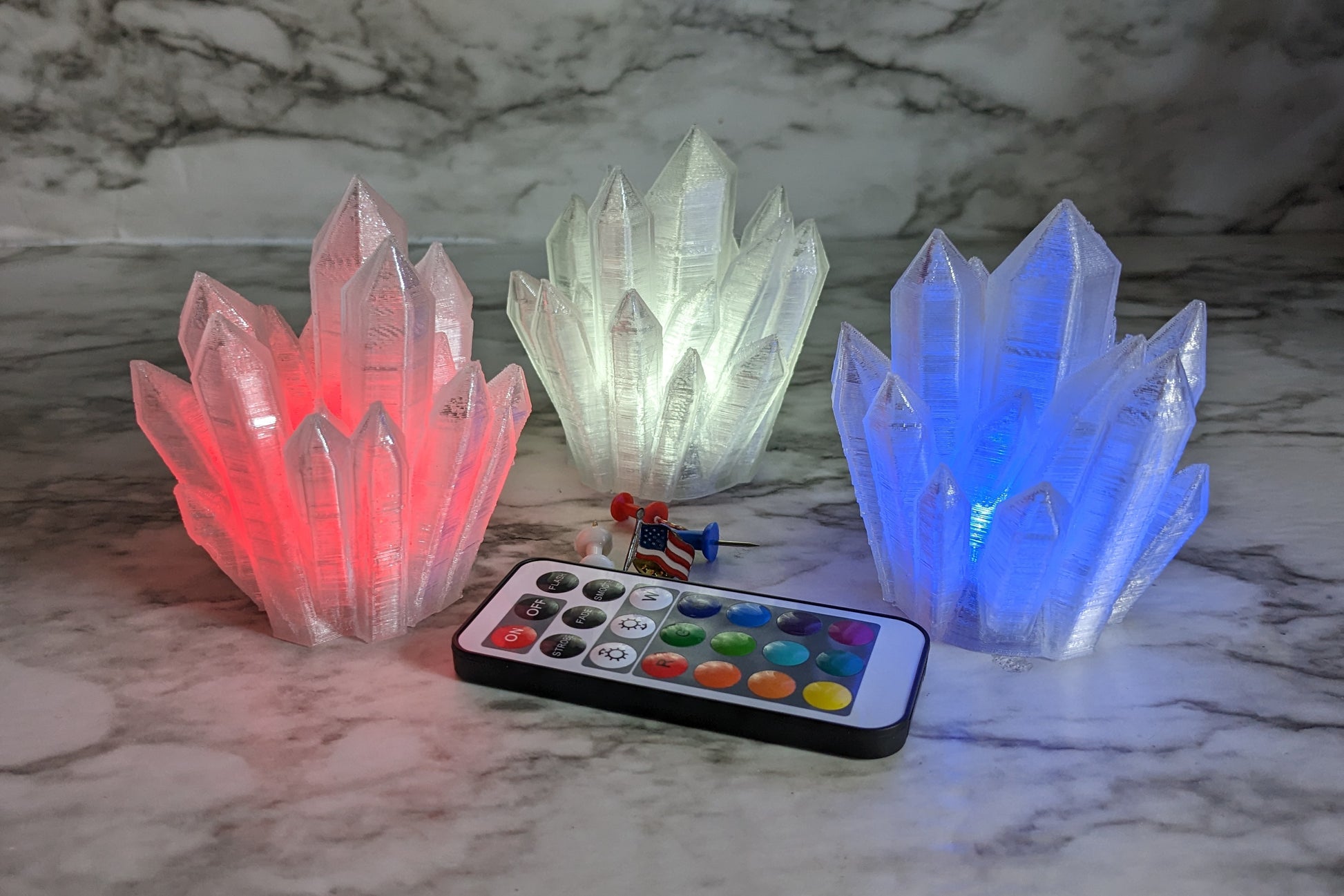 These 3D printed miniature crystal lamps are some of our newest products, they also come with RGB LED lights already inside them, as well as remote controls! Even when off, the crystals allow light to shimmer through them in the most unique and beautiful ways, and are also great for use as accent pieces or night-lights!