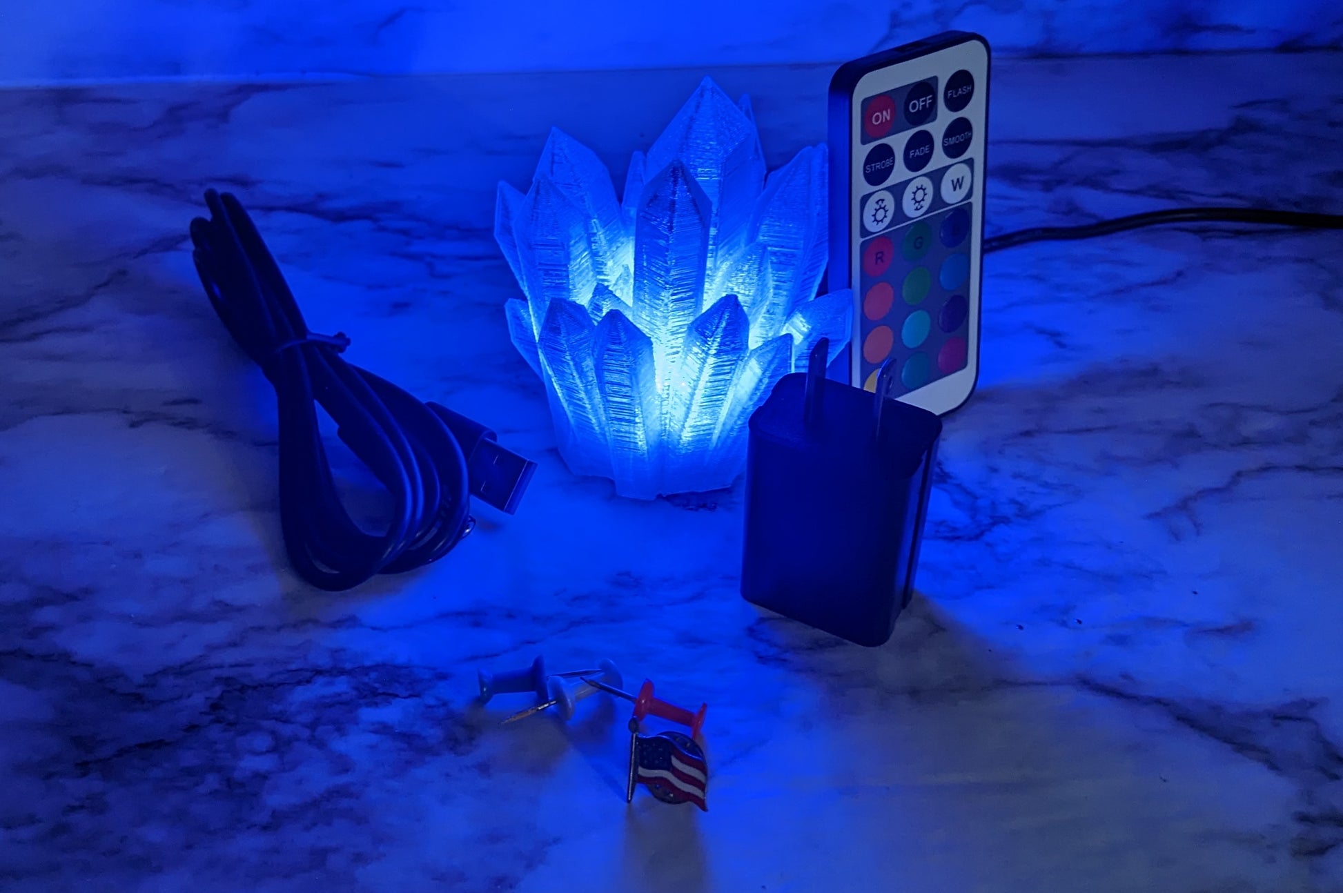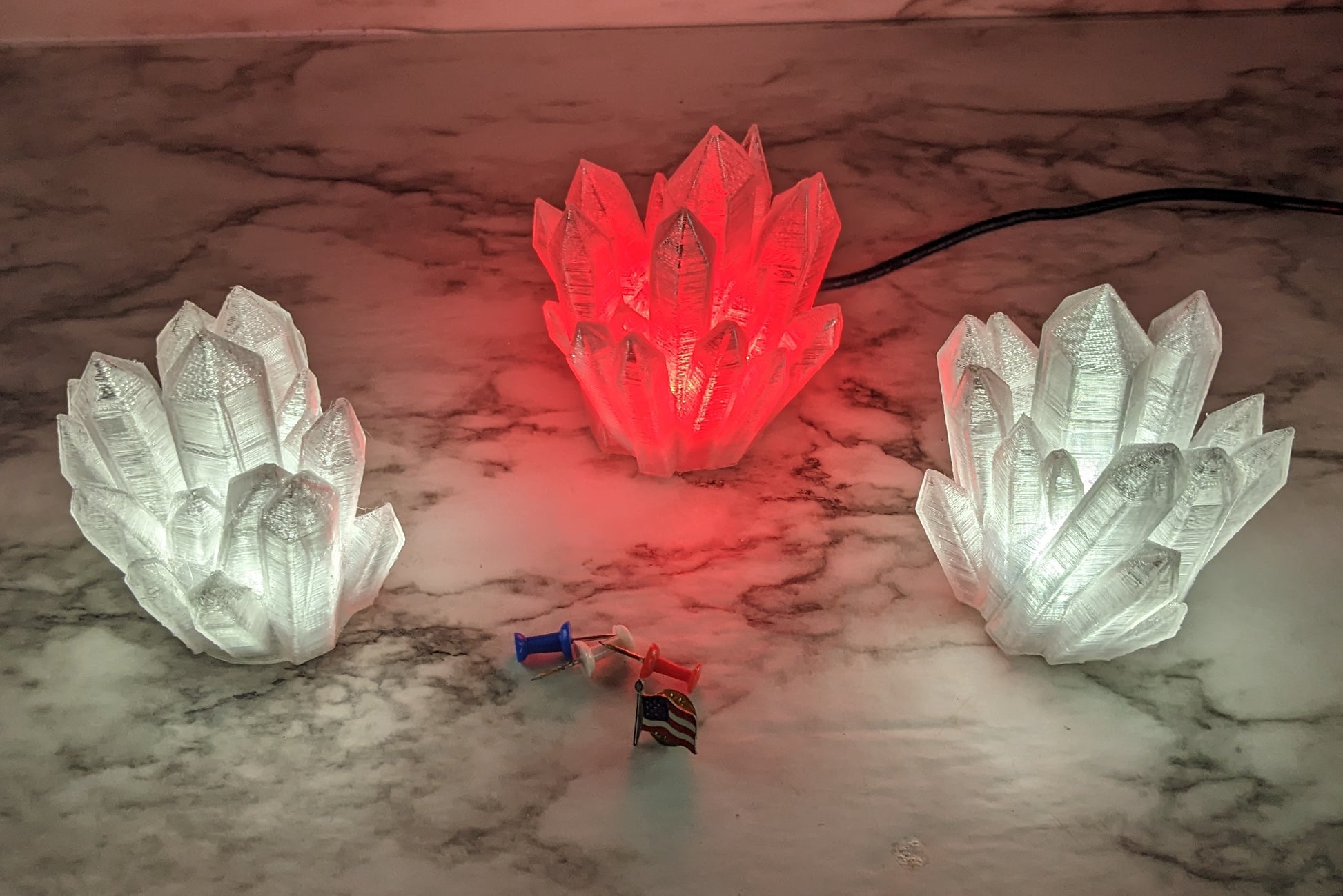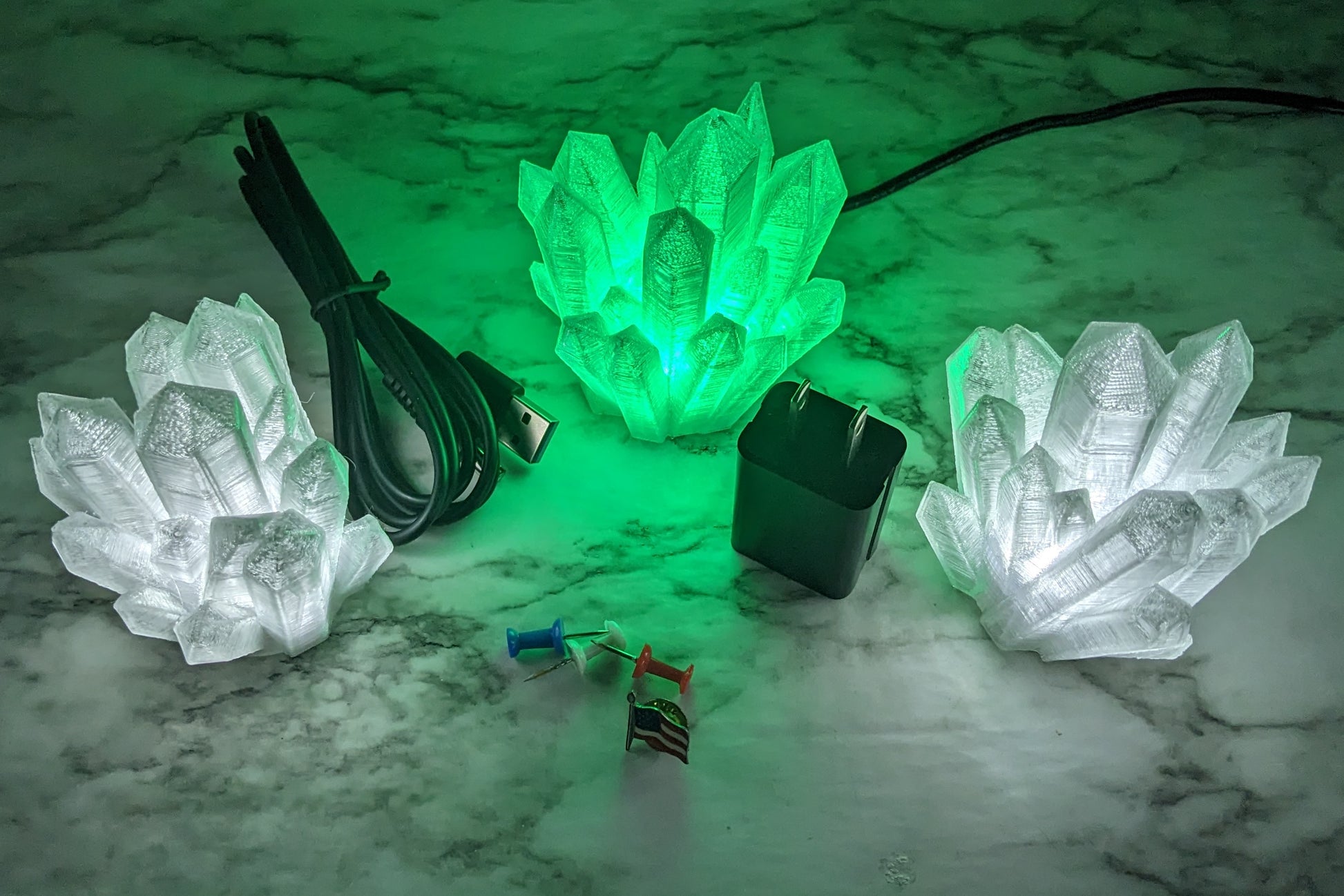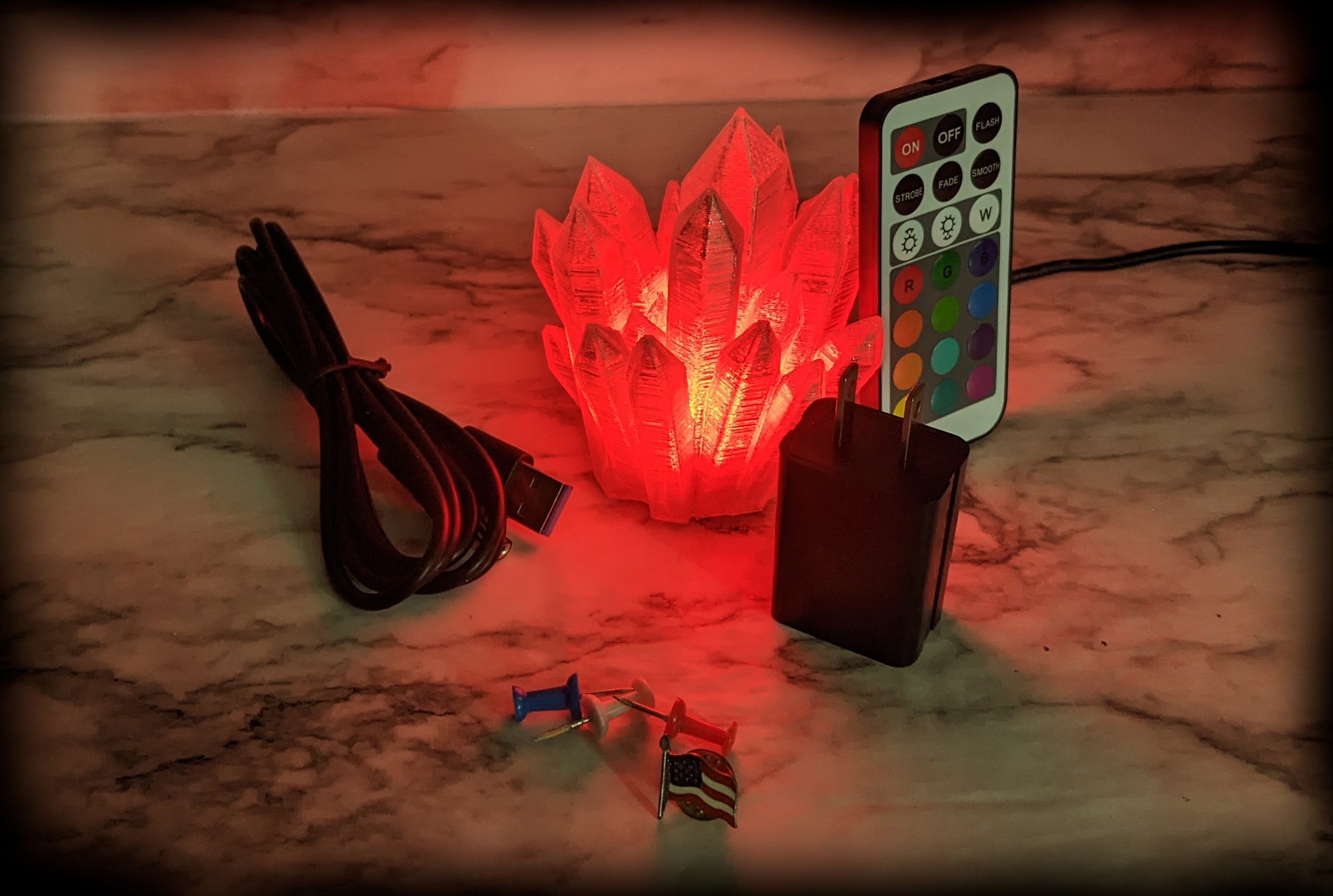 These wall-powered 3D printed miniature crystal lamps are some of our newest products, they also come with RGB LED lights already inside them, as well as remote controls! Even when off, the crystals allow light to shimmer through them in the most unique and beautiful ways, and are also great for use as accent pieces or night-lights!