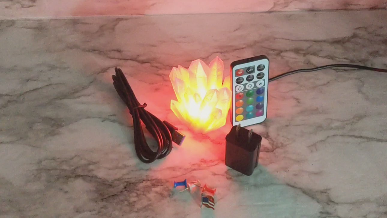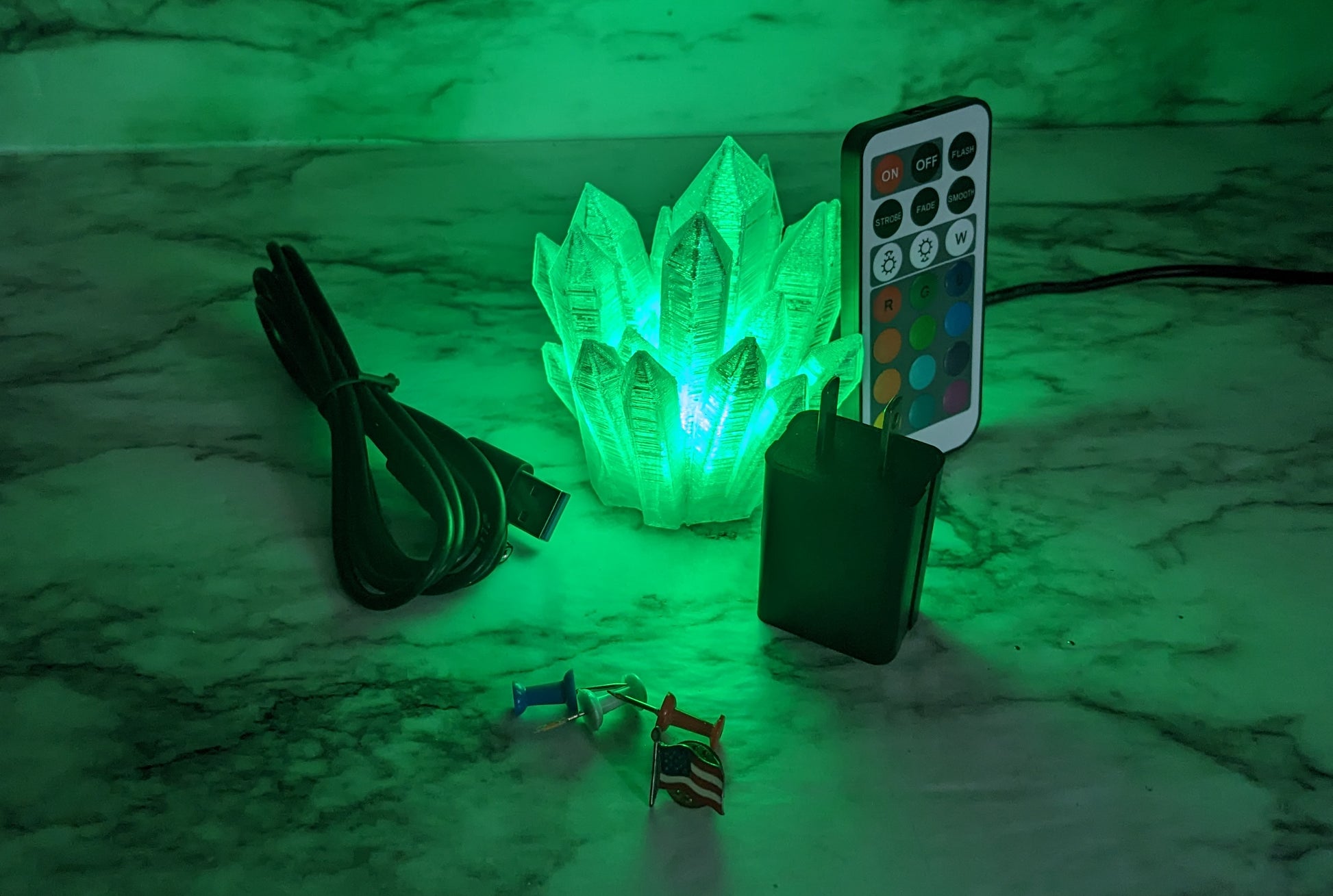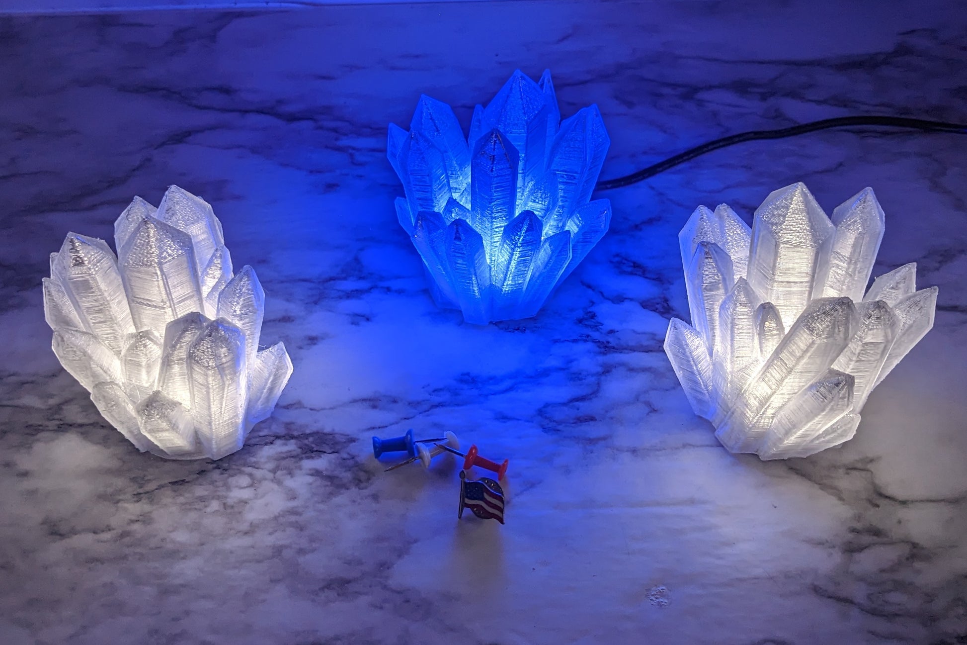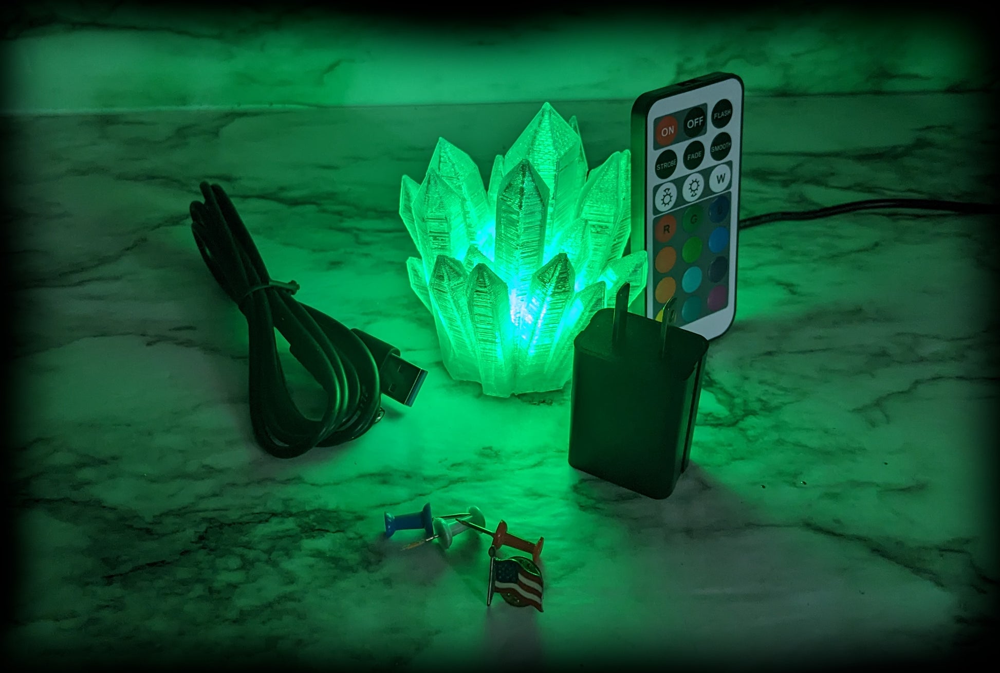 These wall-powered 3D printed miniature crystal lamps are some of our newest products, they also come with RGB LED lights already inside them, as well as remote controls! Even when off, the crystals allow light to shimmer through them in the most unique and beautiful ways, and are also great for use as accent pieces or night-lights!