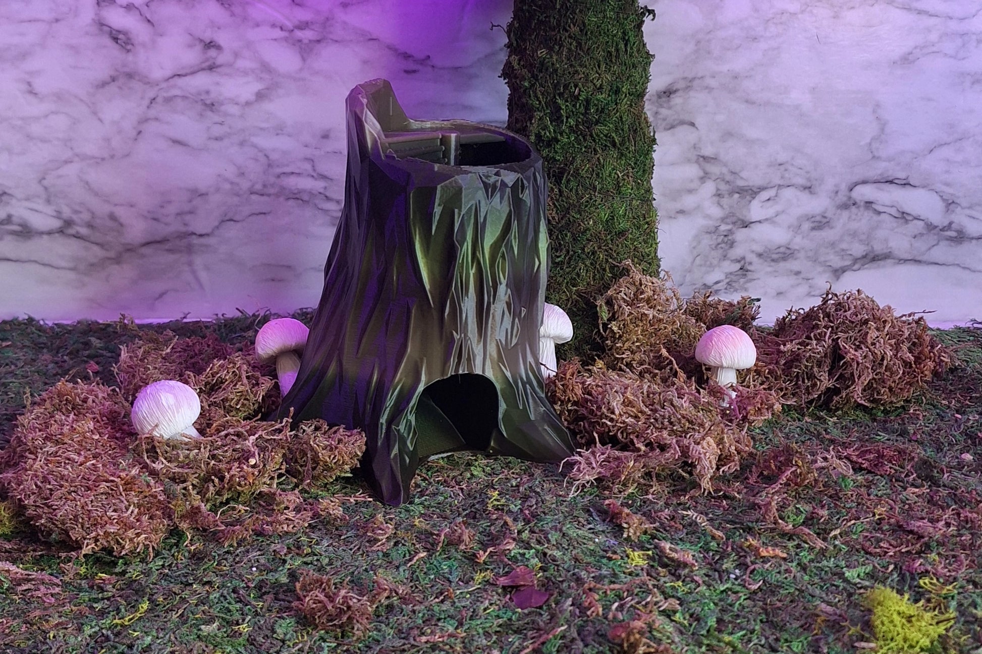 Highly Detailed Tree Stump Design: Modeled to resemble a natural, weathered stump with bark textures, moss-like ridges, and hollowed interior paths.
